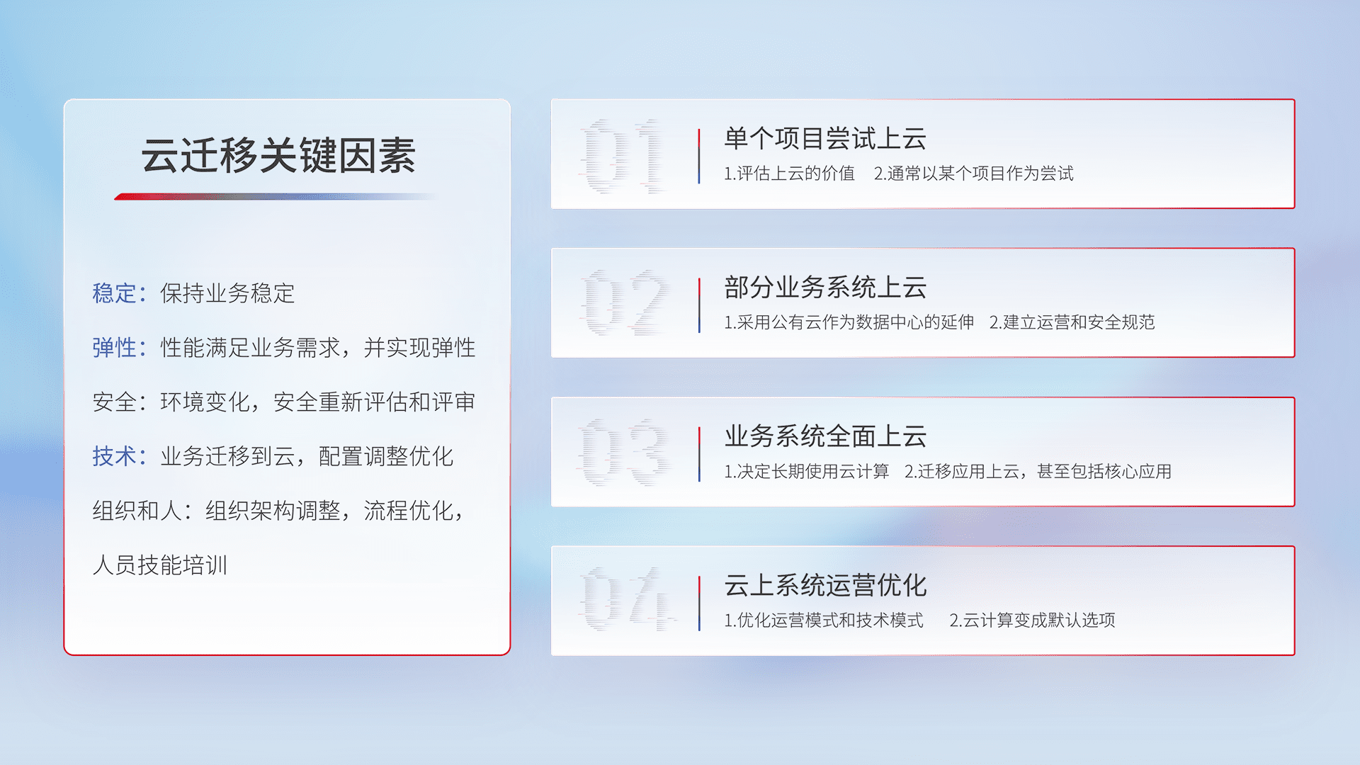 结合实际业务,,,从规划设计、、、云平台选型、、、、云原生改造、、数据迁移、、、集成交付,,,,迁移全过程为客户识别最佳上云路径,,,做好风险识别管理,,,,设计网络架构、、、、身份权限、、、、安全审计合规、、操作审计、、、日志审计、、、、监控告警策略、、多站点容灾设计等,,,,对云上基础设施进行整体规划,,,提升IT治理水平,,以满足弹性、、、高可用、、高性能的需求。。